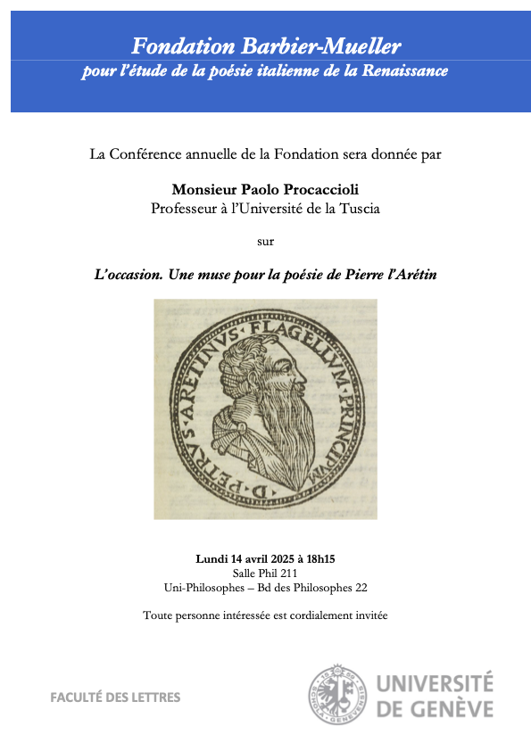 La conférence annuelle de la Fondation Barbier-Mueller pour l’étude de la poésie italienne de la Renaissance, intitulée L’occasion. Une muse pour la poésie de Pierre l’Arétin, sera donnée par le prof. Paolo Procaccioli (Université de la Tuscia) le lundi 14 avril 2025, à 18h15, à l’Uni Philosophes (salle PHIL 211), 22, boulevard des Philosophes, Genève.