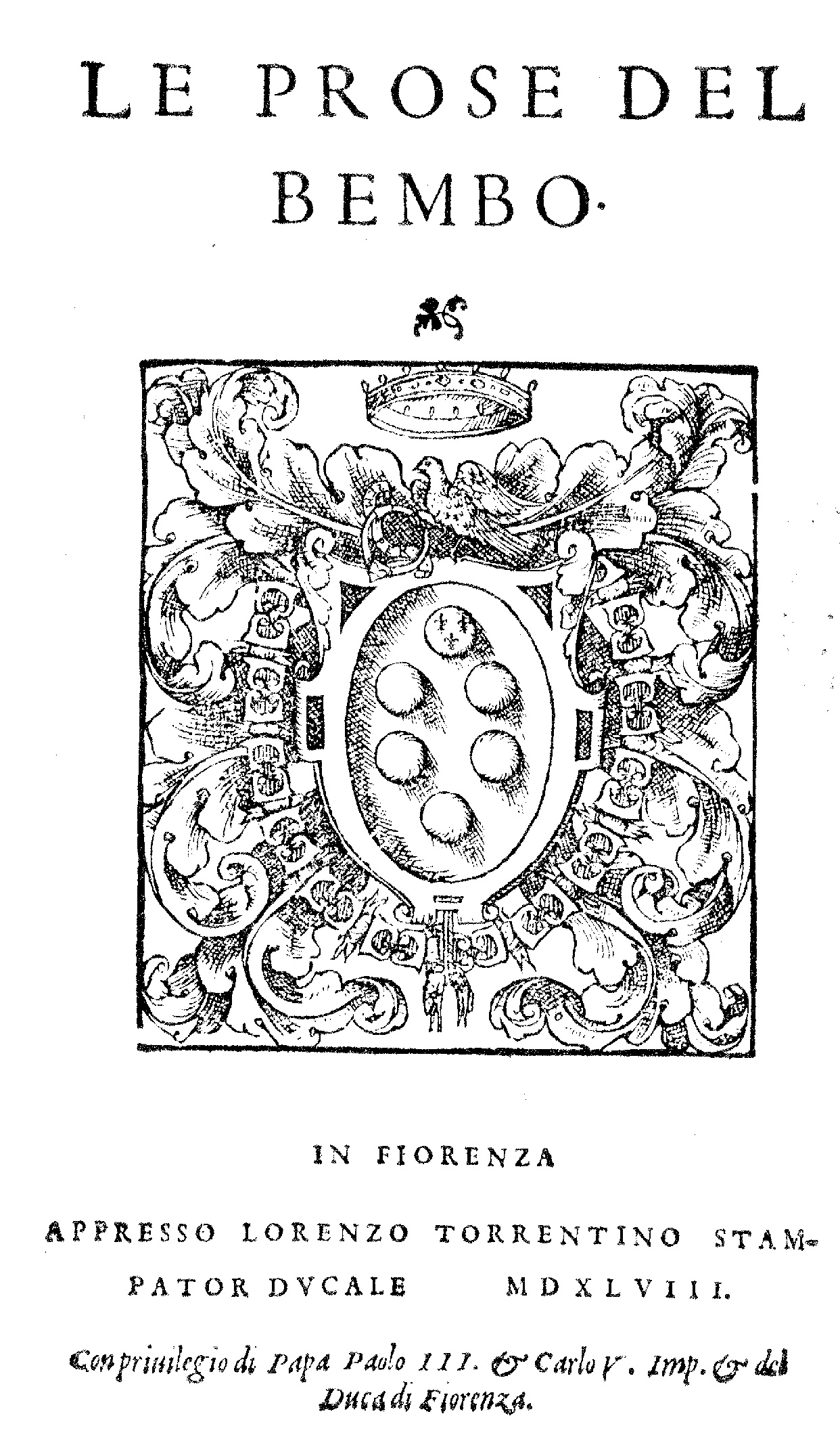 LE PROSE DEL/ BEMBO./ [fleuron]/ [armoiries]/ in fiorenza/ appresso lorenzo torrentino stam-/pator dvcale mdxlviii./ Con priuilegio di Papa Paulo III. & Carlo V. Imp. & del/ Duca di Fiorenza.