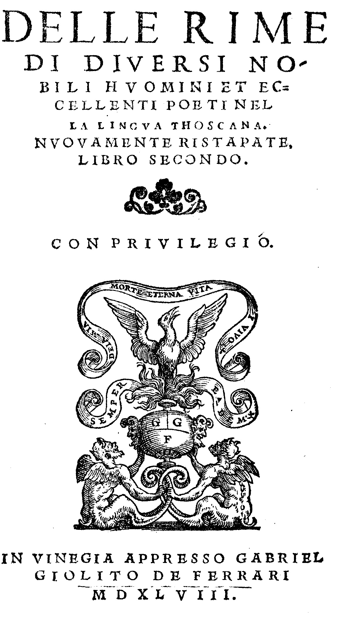 DELLE RIME/ di diversi no-/bili hvomini et ec-/cellenti poeti nel/la lingva thoscana./ nvovamente ristapate [sic]./ libro secondo./ [fleuron]/ con privilegio./ [marque : de la mia morte eterna vita i vivo - semper eadem]/ in vinegia appresso gabriel/ giolito de’ ferrari/ mdxlviii.