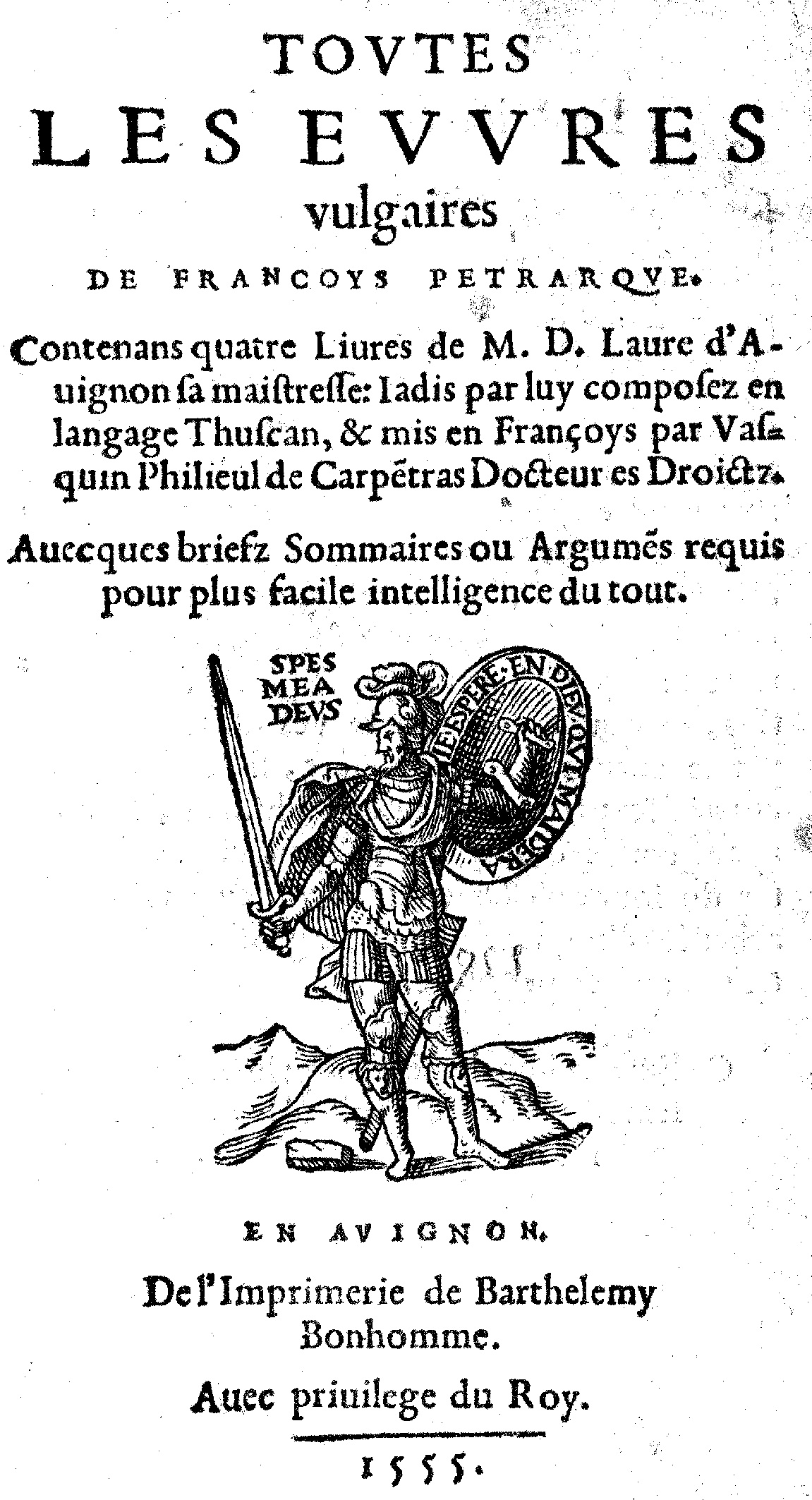 tovtes/ LES EVVRES/ vulgaires/ de francoys petrarque./ Contenans quatre Liures de M. D. Laure d’A-/uignon sa maistresse : Iadis par luy composez en/ langage Thuscan, & mis en Françoys par Vas-/quin Philieul de Carpe[n]tras Docteur es Droictz./ Auecques briefz Sommaires ou Argume[n]s requis/ pour plus facile intelligence du tout./ [marque : spes mea devs/ ie espere en diev qvi maidera]/ en avignon./ De l’Imprimerie de Barthelemy/ Bonhomme./ Auec priuilege du Roy./ 1555.