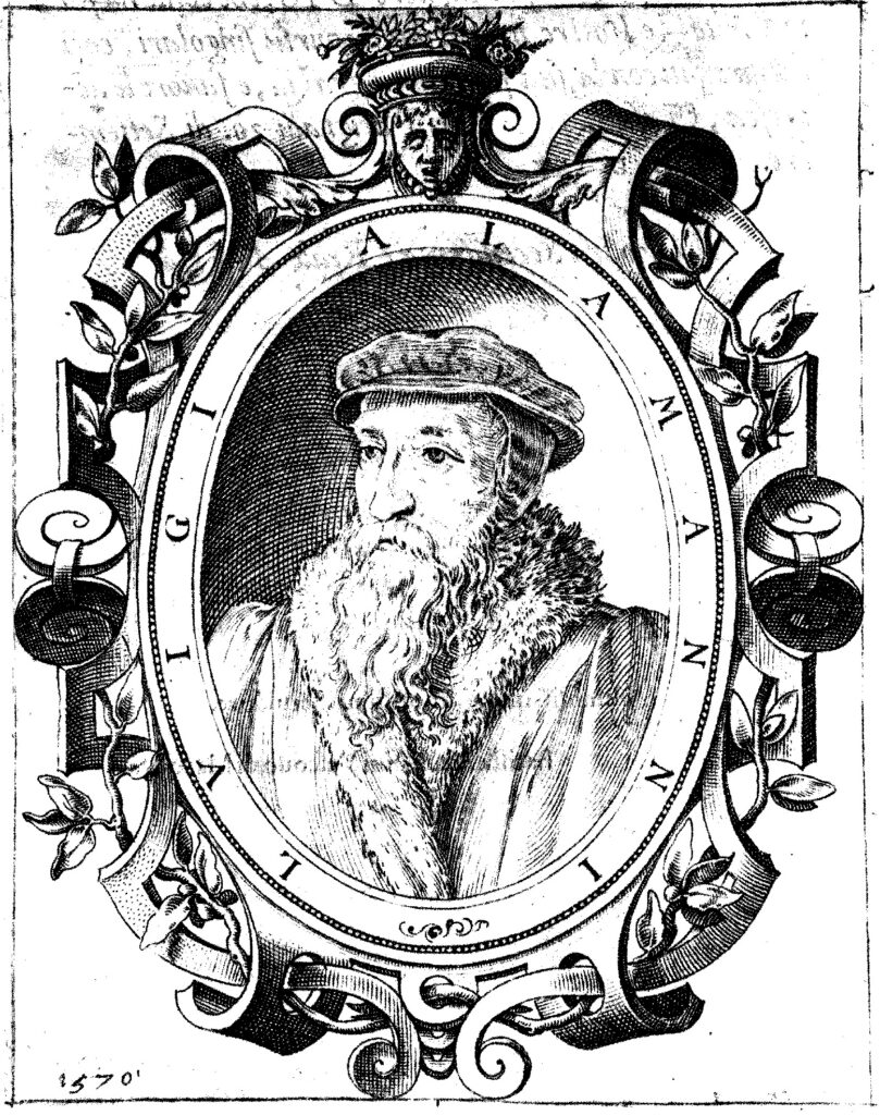 Protégé de Marguerite de France (1523-1574), duchesse de Berry, devenue duchesse de Savoie par son mariage avec le duc Emmanuel-Philibert en 1559, Luigi Alamanni composa pour la princesse un poème épique en italien sur le modèle de l’Iliade, relatant en vingt-quatre chants les exploits de Lancelot au siège d’Avaricum (ancien nom de Bourges, capitale du duché de Berry) par les chrétiens et la victoire de ces derniers sur les païens. Il chargea son fils Battista Alamanni (né en 1519), évêque de Mâcon, de publier son œuvre. Celle-ci ne parut qu’en 1570, quatorze ans après la mort du poète; elle fut imprimée en Italie et non pas en France.