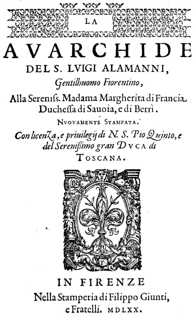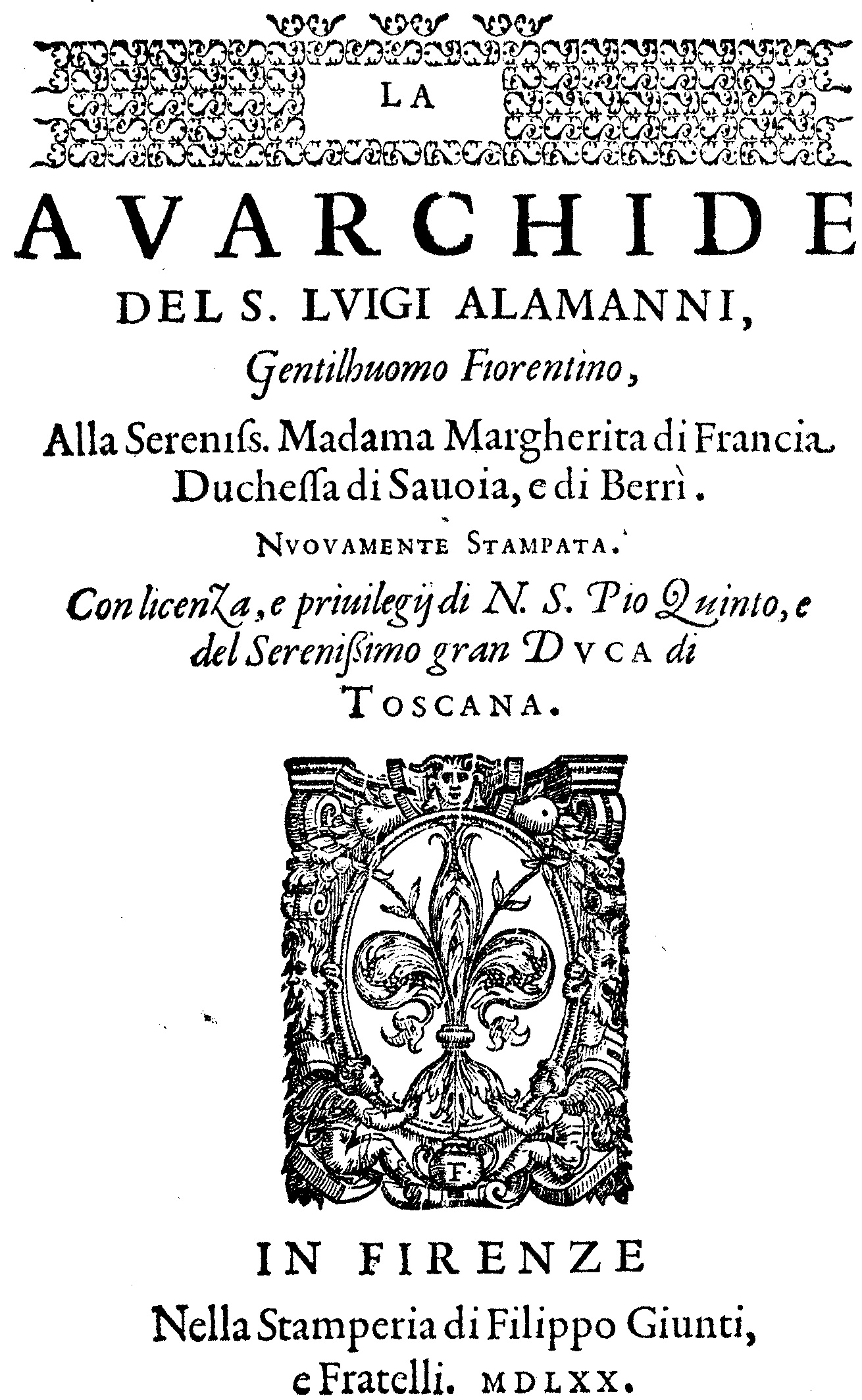 [ornement typographique] la/ AVARCHIDE/ del s. lvigi alamanni,/ Gentilhuomo Fiorentino,/ Alla Sereniss. Madama Margherita di Francia/ Duchessa di Sauoia, e di Berri./ Nvovamente Stampata./ Con licenza, e priuilegi di N. S. Pio Quinto, e/ del Serenissimo gran Dvca di/ Toscana./ [marque]/ in firenze/ Nella Stamperia di Filippo Giunti,/ e Fratelli. mdlxx.