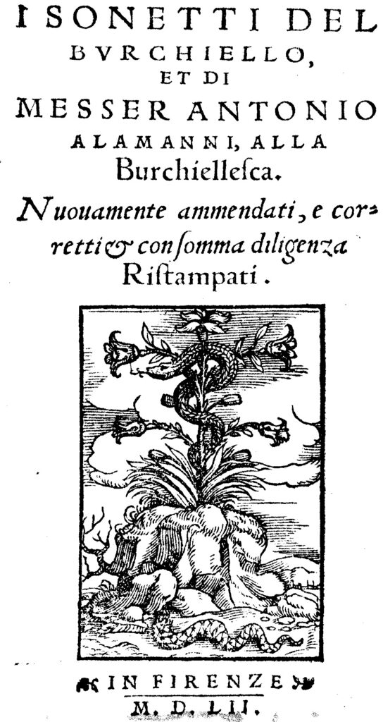 i sonetti del/ bvrchiello,/ et di/ messer antonio/ alamanni, alla/ Burchiellesca./ Nuouamente ammendati, e cor-/retti & con somma diligenza/ ristampati./ [marque]/ in firenze/ m.d.lii.